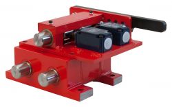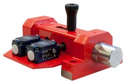 Durch pneumatische bzw. manuelle Betätigung des Handgriffs wird der Bolzen aus der Ruhelage in die Verriegelungsstellung gebracht, damit keine unbeabsichtigte oder unbefugte Maschinenbewegung möglich ist.